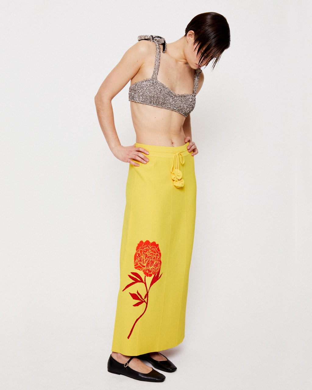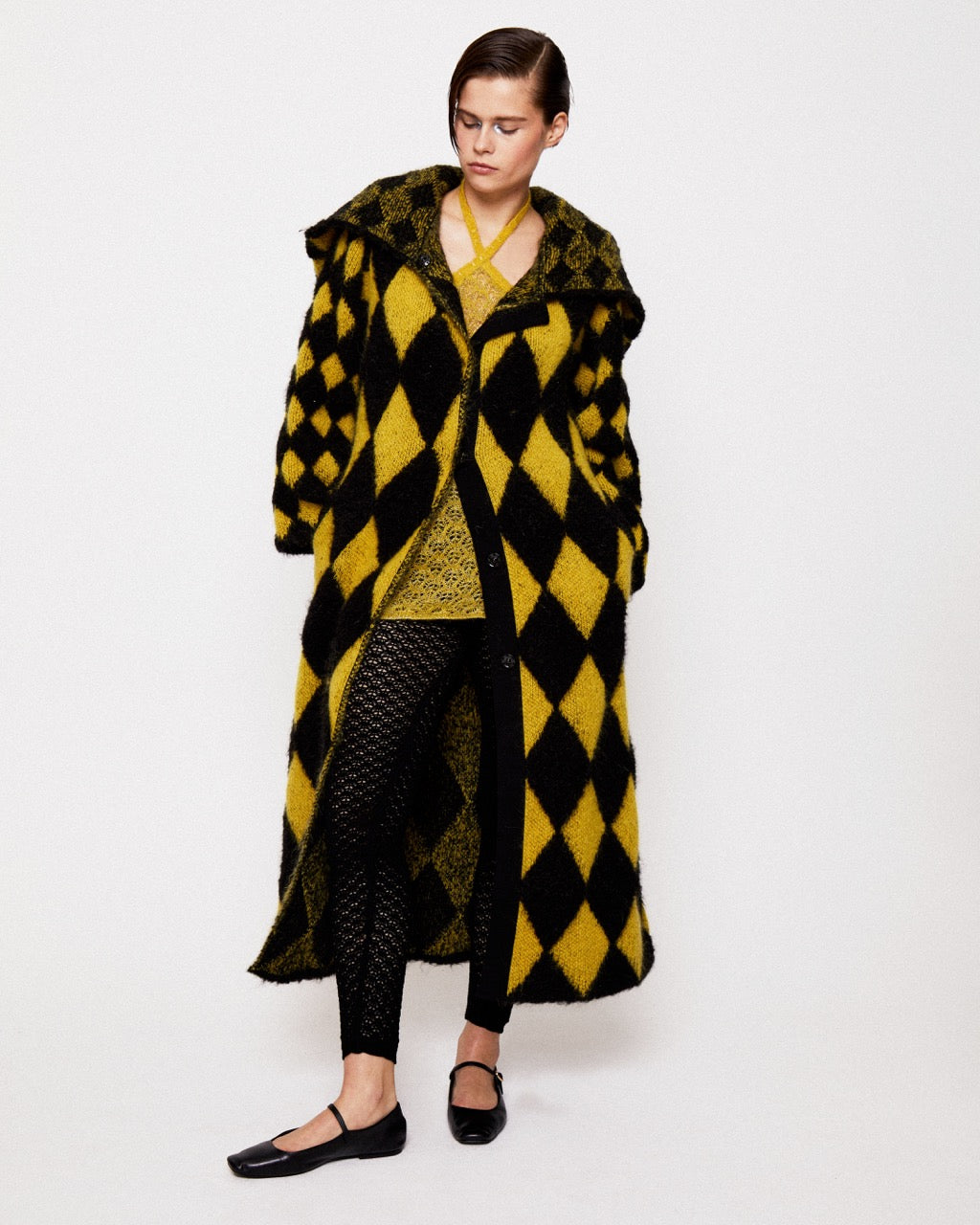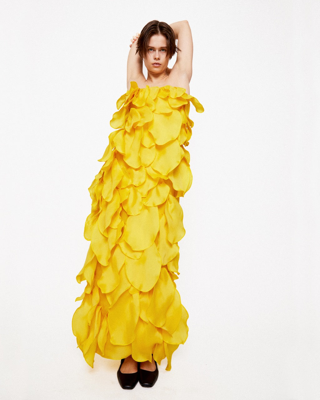 This collection references classic ball gowns within the voluminous petal pieces, rendered both in silk organza and in silk knitted yarns. Classic tailoring techniques are also utilised within the knitted coats, incorporating shoulder padding, geometrical necklines, and bold colors. The knitted coats are inspired by silhouettes of classic fur coats, but modernized through the use of 3D knitting. Necklines and collars are enhanced with volume and shape, adding a hint of regality to the pieces.