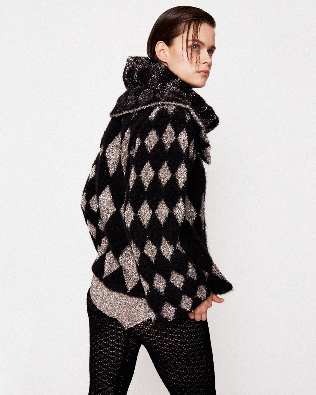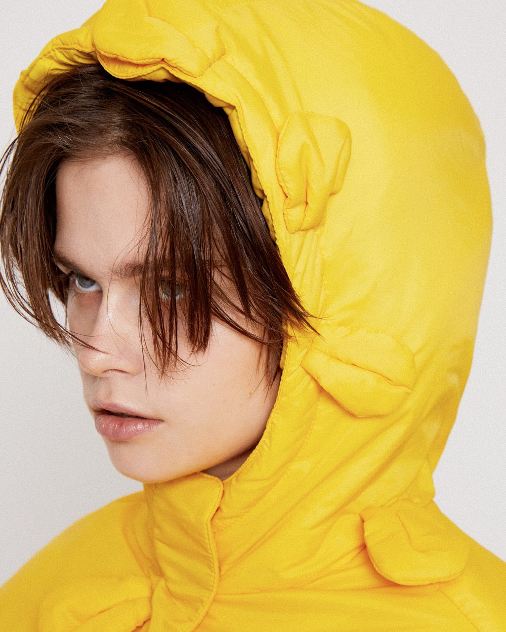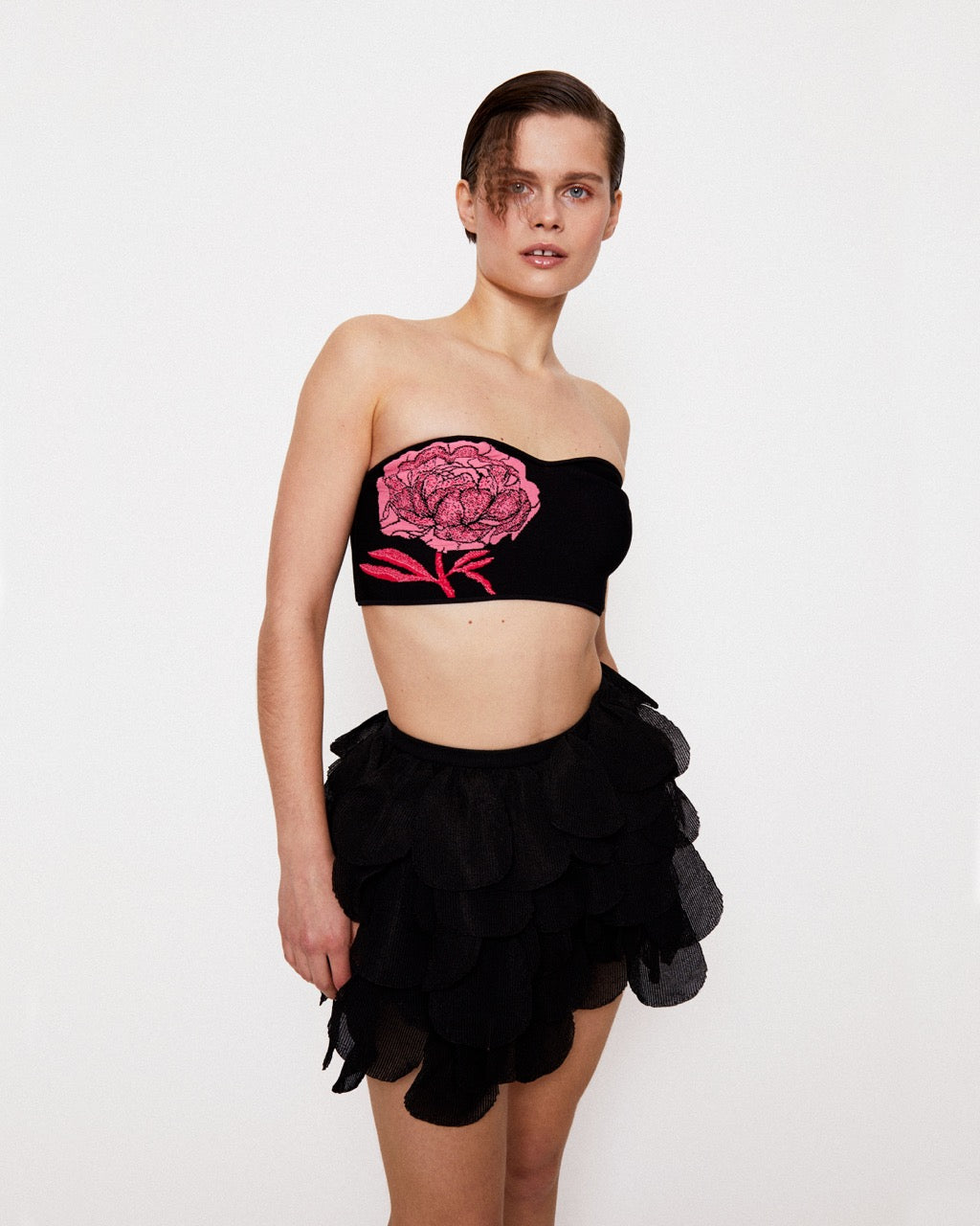 This collection references classic ball gowns within the voluminous petal pieces, rendered both in silk organza and in silk knitted yarns. Classic tailoring techniques are also utilised within the knitted coats, incorporating shoulder padding, geometrical necklines, and bold colors. The knitted coats are inspired by silhouettes of classic fur coats, but modernized through the use of 3D knitting. Necklines and collars are enhanced with volume and shape, adding a hint of regality to the pieces.